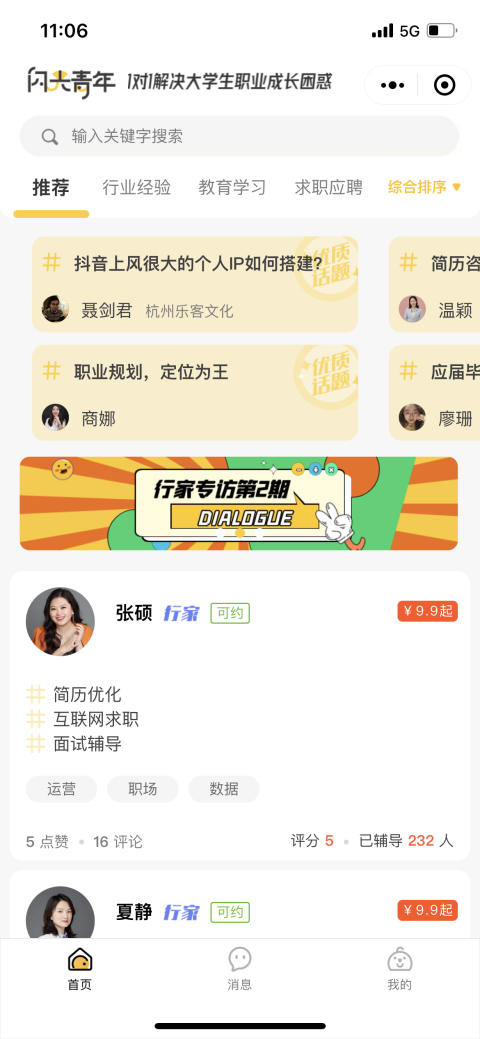 在“闪光青年BlingBling”小程序上,学生可以选择自己感兴趣的类别(行业经验、教育学习、求职应聘、个人成长、互联网等),找到相匹配的职场行家进行咨询。