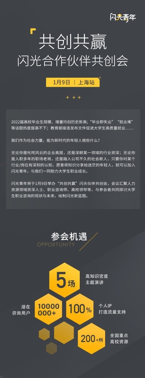 据了解,本次“共创共赢”闪光伙伴共创会是闪光青年发起的第一届行家交流大会,会议将在上海国家会展中心郁锦香酒店举行。